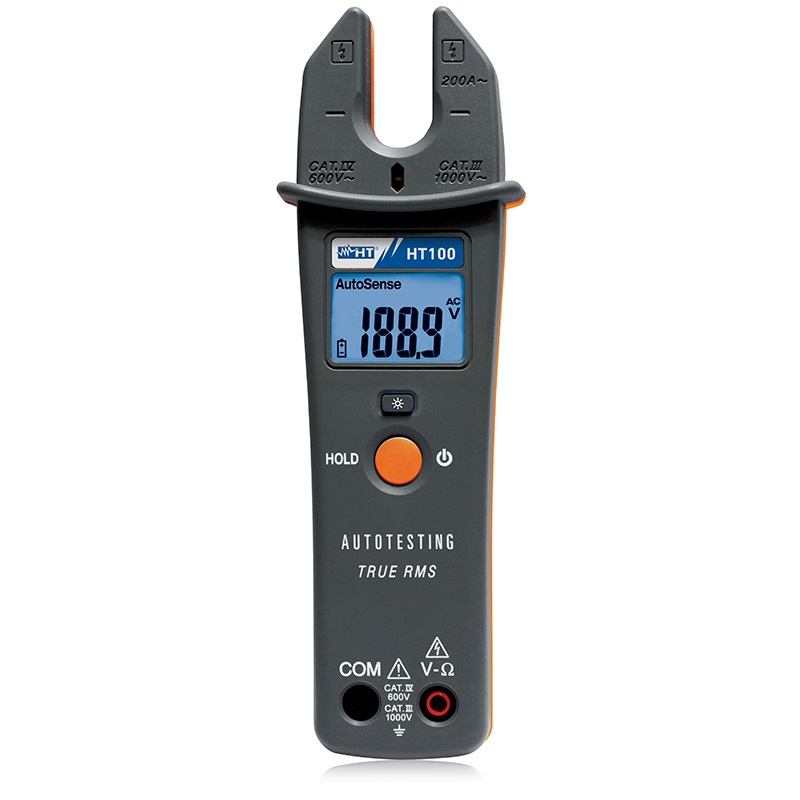 Profesionalni merilnik s kleščami HT100 je opremljen s samodejnim prepoznavanjem funkcij ali merjenjem izmeničnega toka do 200 A in izmenične/ enosmerne napetosti do 1000 V v TRMS za doseganje CAT IV 600 V in CAT III 1000 V.